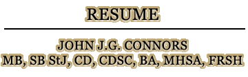 NATIONALITYCANADIAN LANGUAGESEnglish/French (some German, Spanish, Latin) PRINCIPAL EXPERIENCE(20 years Regular and 7 Reserve - Canadian Forces Medical Services, 20+ years civilian) * Chief Executive Officer/Operating Officer of not-for-profit governmental and private health services and health and safety, educational and research facilities and organizations at regional and national levels, * Consultant in a wide range of health services, occupational health and safety and management areas, including emergency services, home care and telehealth and e-health applications, and * Canadian Forces health services educator, evaluator, manager and leader at unit, regional, national and international levels. PRIMARY SKILLS* learn quickly into a particular field or issue, * set and achieve short and long term goals with innovation, efficiency and cost-effectiveness, * accomplished written and verbal communicator, educator, promoter and marketer, * infectiously enthusiastic and proven leader in variety of organizational settings, * seek, recognize and establish partnerships and networks, * effective with all organizational levels: private and public, management and labour, professional and technical, * accomplished manager of change and of conflict, and * proven fund raiser and generator of revenue. EDUCATION1975 to Present: Numerous health services and organizational management conferences, courses, workshops and seminars attended, presented and organized, including participation as a participant / presenter , 9th Course on the International Law of Armed Conflicts, conducted by the International Committee of Military Medicine and the Swiss Armed Forces, Spiez, Switzerland, August 17-24, 2007. Sep 73 - May 75 Master of Health Services Administration (M.H.S.A.), University of Alberta. Nov 71 - Jul 72 Diploma, United States Army Medical Department Officer Advanced Course, Brooke Army Medical Centre, Texas, including 3 credit hours in Hospital Community Relations (Baylor University) and three non-credit hours in Hospital Facility Planning. 1969 - 1988 Certificates from the Canadian Forces - Medical Associate Officer Field (1969), Medical Associate Officer Administration (1969), Unit Emplaning Officer (1972), Basic Parachutist (1973), Medical Advanced Field Officers' Course (1985), various NATO courses in Europe 1985 - 1988. Sep 65 - May 69 Bachelor of Arts (B.A.), (English, History, Philosophy, Economics, French, Political Science), Saint Patrick's College of the University of Ottawa and Carleton University. EXPERIENCE- Currently - PRESIDENT , ChilCana Consulting CANADA , Stoney Creek , since March 1997. - April 1997 to September 1998 - CHIEF EXECUTIVE OFFICER, Victorian Order of Nurses Branch and Foundation (VON H-W), Hamilton. - March 1994 to December 1996 - EXECUTIVE DIRECTOR, Ontario Natural Resources Safety Association, (ONRSA), North Bay. - September 1990 to April 1993 - CHIEF OPERATING OFFICER, Windsor Regional Cancer Centre, (OCTRF), Windsor. - August 1989 to September 1990 - STAFF OFFICER FOR POLICY AND PLANNING OF MEDICAL STAFFING AND TRAINING, National Defence Headquarters, Ottawa. - August 1988 to August 1989 - STAFF OFFICER PERSONNEL SERVICES (and special planning cell writer), Canadian Forces Hospital and Medical Supply System Headquarters, Ottawa. - November 1987 to August 1988 - STAFF OFFICER MEDICAL PLANS, Headquarters, Canadian Forces Europe, Lahr, West Germany. - August 1985 to November 1987 - STAFF OFFICER MEDICAL OPERATIONS AND PLANS, Canadian Forces Hospital Europe, Lahr, West Germany. - June 1984 to July 1985 - STAFF OFFICER MEDICAL ADMINISTRATION, Maritime Command Headquarters, Halifax. - June 1983 to June 1984 - STAFF OFFICER MEDICAL OPERATIONS, Central Militia Area Headquarters, Toronto. - July 1980 to June 1983 - EXECUTIVE DIRECTOR, Muscular Dystrophy Association of Canada, Toronto. - May 1979 to June 1980 - EXECUTIVE DIRECTOR, Five Counties Children's Centre, Peterborough. - August 1977 to May 1979 - STAFF OFFICER FOR IMPLEMENTATION AND CO-ORDINATION OF MEDICAL STAFFING AND TRAINING, National Defence Headquarters, Ottawa. - May 1975 to July 1977 - REGISTRAR, National Defence Medical Centre, Ottawa. - April 1974 to August 1974 - CONSULTANT: Special Health Projects, to the Chief Deputy Minister of Health, Alberta Department of Social Services and Community Health, Edmonton. - September 1965 to April 1975 - Except for periods of formal education, during this time trained and commanded operational medical field elements of the Canadian Forces in Alberta, Ontario, Quebec, New Brunswick and Norway. PRESENTATIONS / PUBLICATIONSConsultant / Presenter, "Regional and Institutional Emergency Preparedness Workshops and Meetings", for Asociacion Chilena de Seguridad and Chilean Ministry of Health, Coyhaique and Aysen, Region XI, Chile, September 6-7, 2007. Chair and Lecturer, "Healthcare Emergency Preparedness Course", Federated Press/Sheraton Centre, Toronto , March 8-9, 2005. Support Centre Medical & Operations Controller (volunteer), World Youth Days & Papal Visits, Toronto, July/August 2003. (previously organized medical support for Papal visit, Halifax, 1984) Connors, J.J.G. "Principles and Planning for High Altitude, Cold Weather Survival". Workshop presented to 50+ mining executives and emergency services specialists, organized by the Asociacion Chilena de Seguridad (Chilean Safety Association), Copiapo, Chile, August 28, 2001. (3 hours, no paper) Connors, J.J.G. "Telehealth Issues with a Canadian Overview", TELEHEALTH MEETING OF THE FOUNDATION FOR SCIENCE AND TECHNOLOGY AND THE UNIVERSITY OF DESARROLLO, Santiago, Chile, August 27, 2001. (PowerPoint 32 slides + 71 Medical Post slides) Connors, J.J.G. "Health Facilities: Principles and Issues in Planning and Practising for Disasters". Presented to between 50 and 100 health services executives and emergency services specialists, organized by the Asociacion Chilena de Seguridad (Chilean Safety Association), Concepcion, Temuco, Cop
